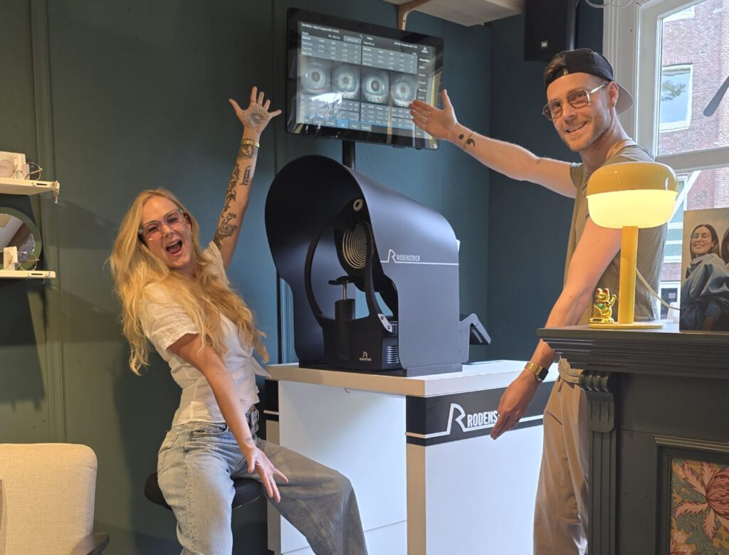 Met onze DNEye scanner brengen we al die elementen super nauwkeurig in beeld en maken we als het ware een biometrische vingerafdruk van je ogen, die Rodenstock vervolgens in een glas prent. Denk dan bijvoorbeeld aan de dikte en vorm van je hoornvlies, de grootte van je pupil (zowel overdag als ‘s avonds) en de lengte van je oog. Maar ook de as en sterkte van je cilinder die een paar graden of dioptrie verandert als je naar beneden kijkt, in plaats van rechtuit in het oneindige. We kunnen er eindeloos over praten want we zijn eindeloos enthousiast, maar daarvoor kun je misschien het best maar gewoon even langskomen. Dan laten we je alles zien.